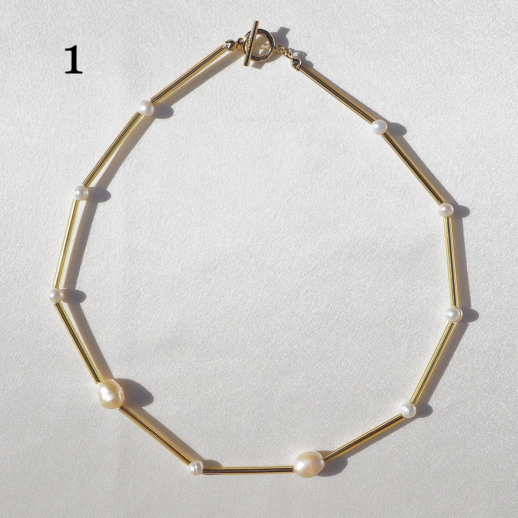 Polygonは多角形という意味。淡水パールとゴールドの竹ビーズを使用したシンプルなデザインのビーズネックレスです。ポイントで入れた一回り大きめのパールはピンクっぽいホワイトカラー。