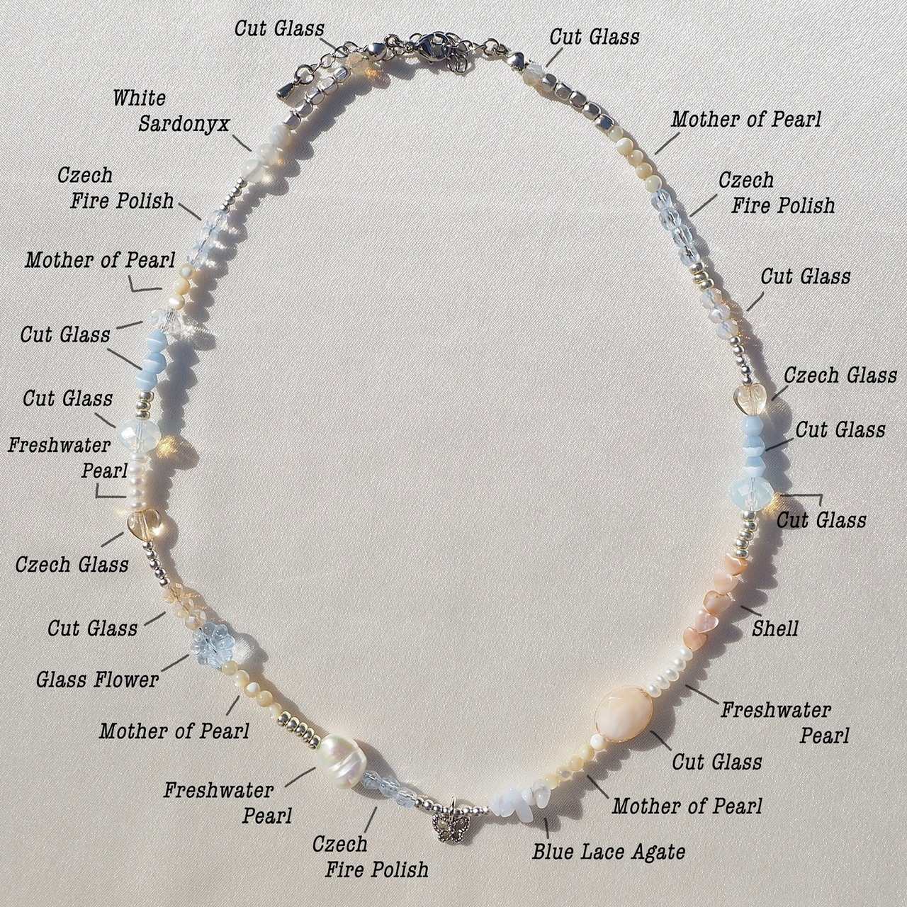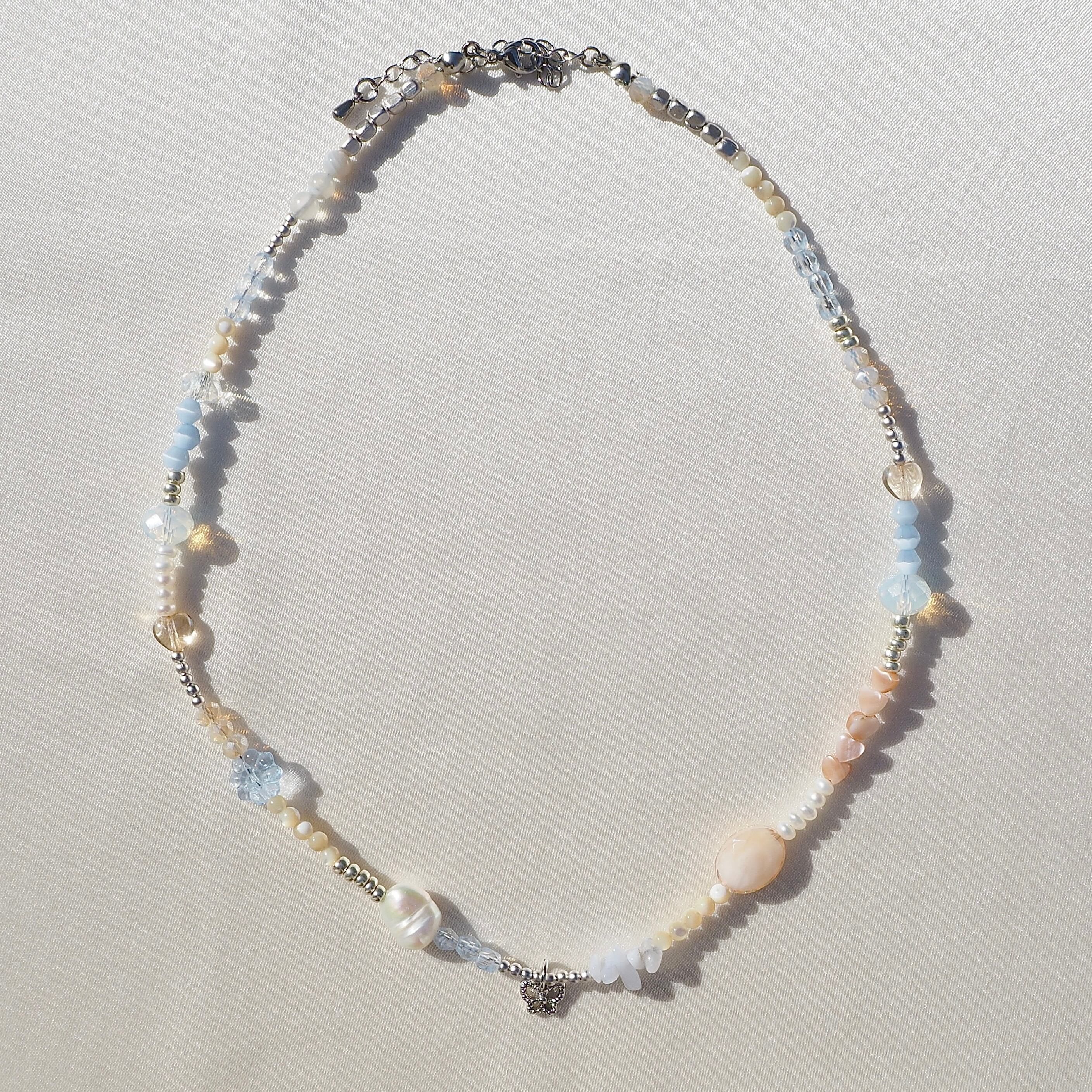 日光で輝くガラスビーズと淡水パールを散りばめ、まるでキラキラ空を舞う蝶々のようなネックレス。ブルーカラーで青空を閃く青い蝶々をイメージ。