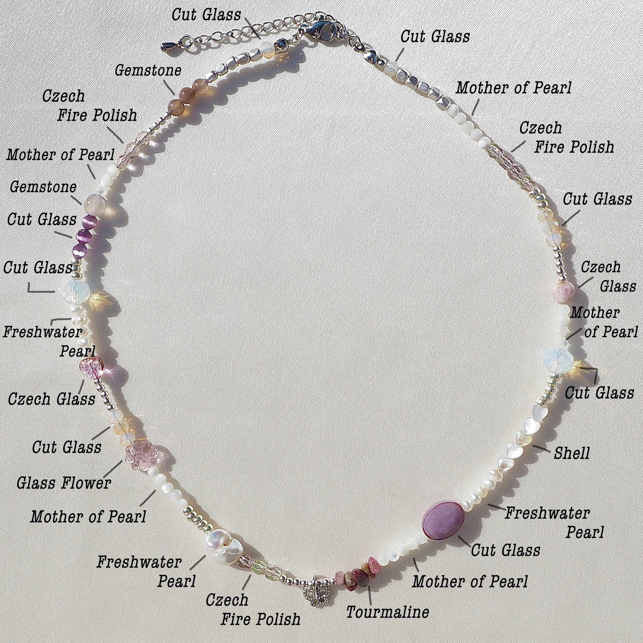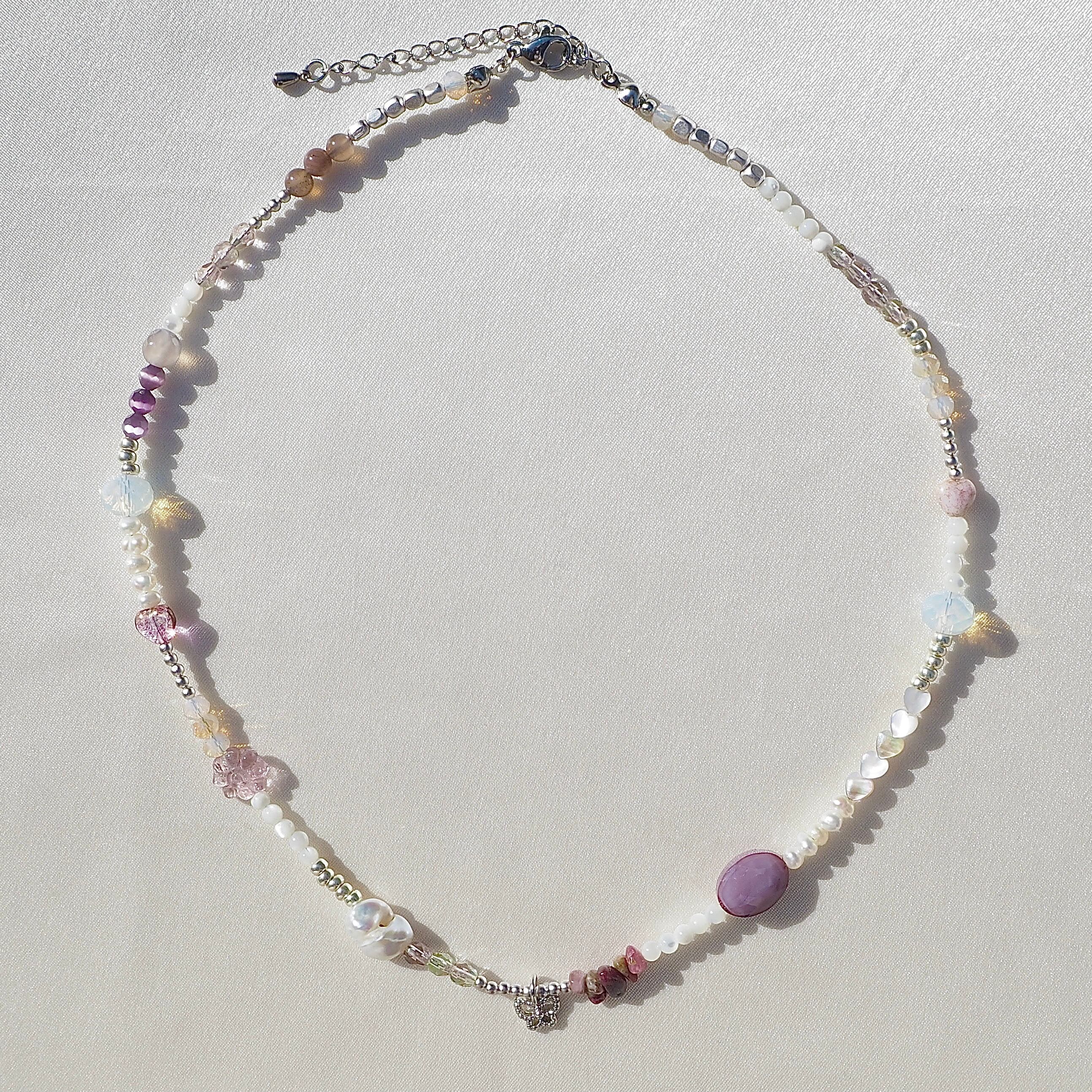 日光で輝くガラスビーズと淡水パールを散りばめ、まるでキラキラ空を舞う蝶々のようなネックレス。パープルカラーで空を閃く紫の蝶々をイメージ。