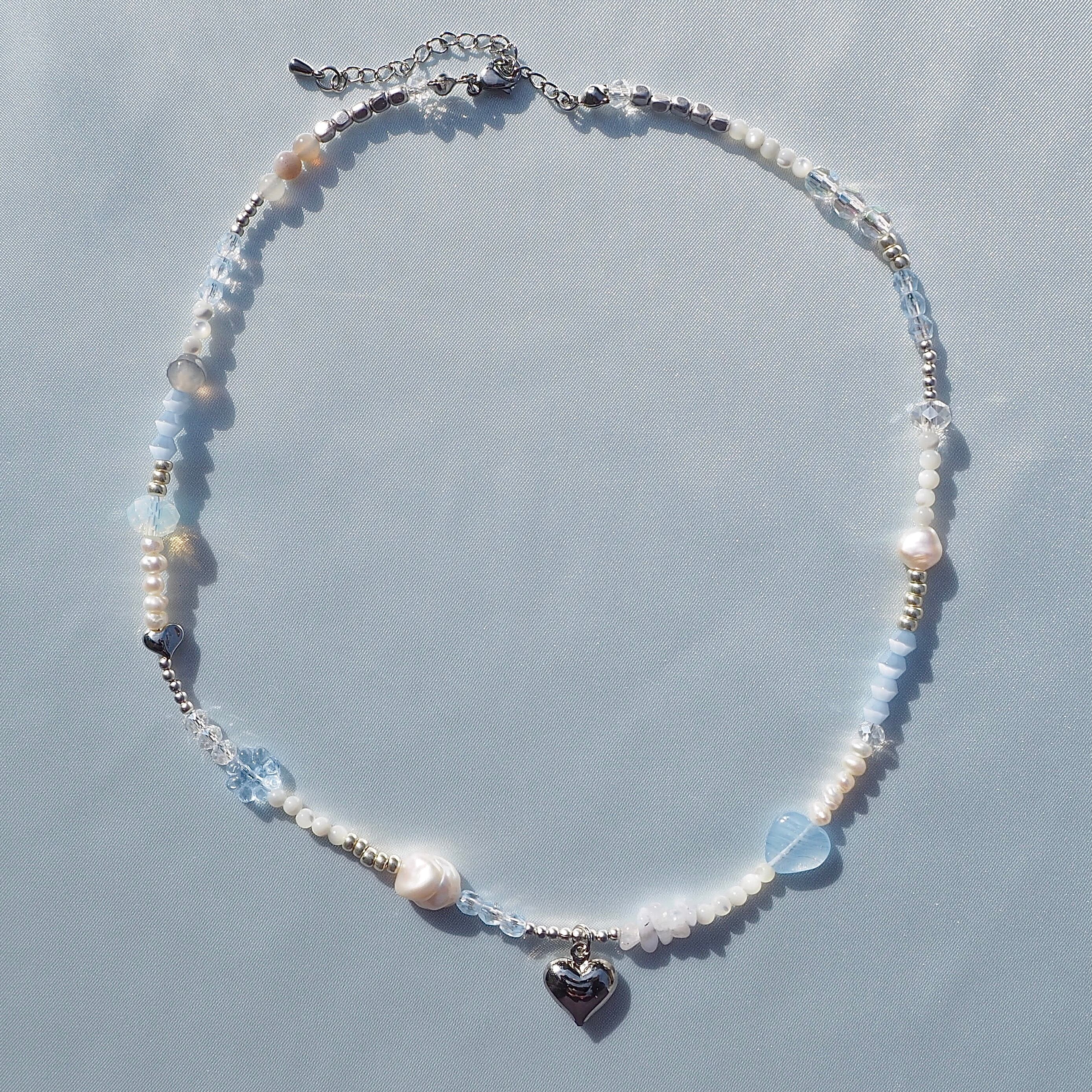 みんなに愛されるハートデザイン。ガラスビーズと淡水パールの輝きがとても綺麗です。