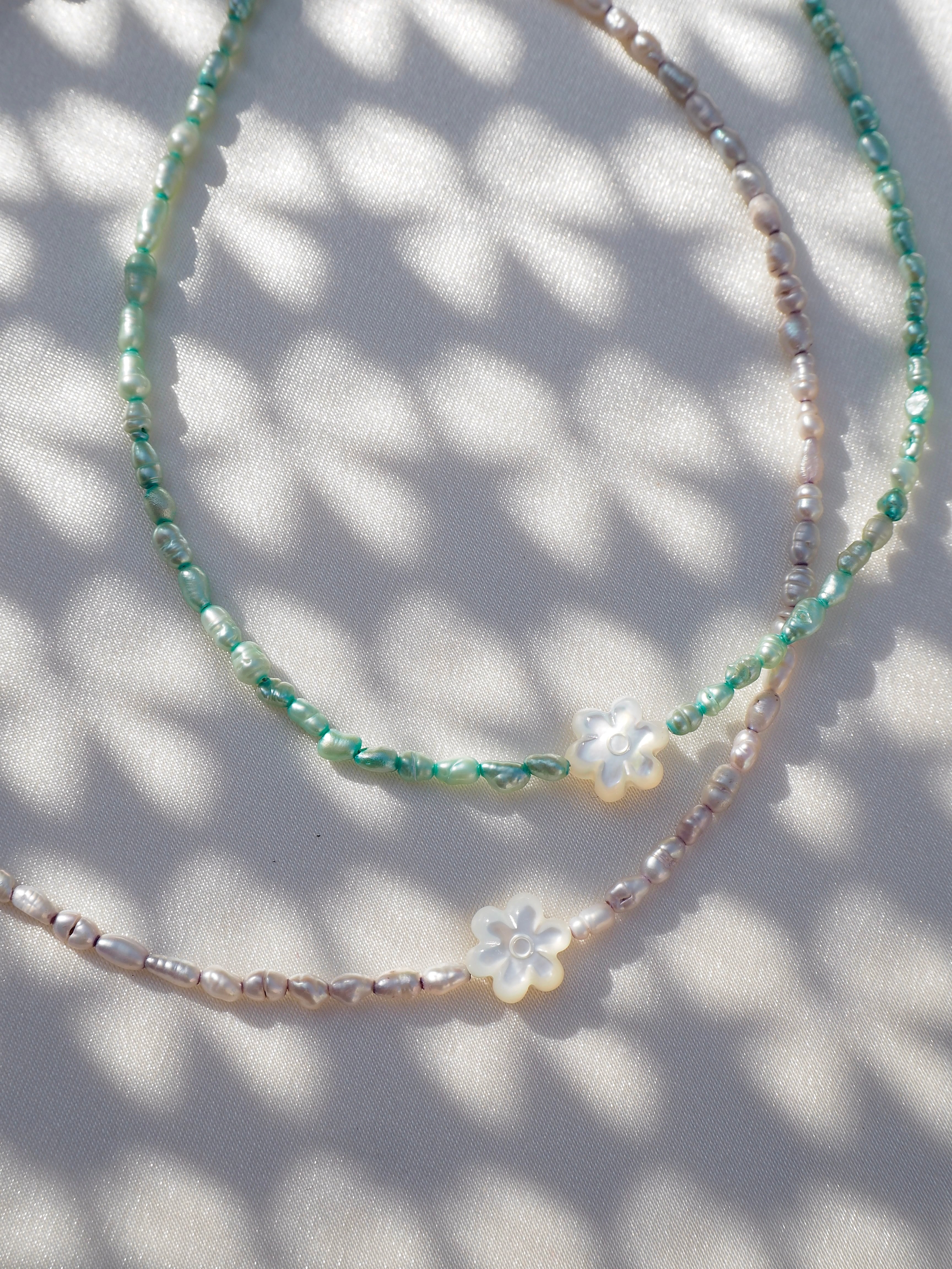 人気のフラワーデザイン。フラワービーズはシェル、淡水パールは染めのものを使用。パープルとグリーンの2色からお選びいただけます。