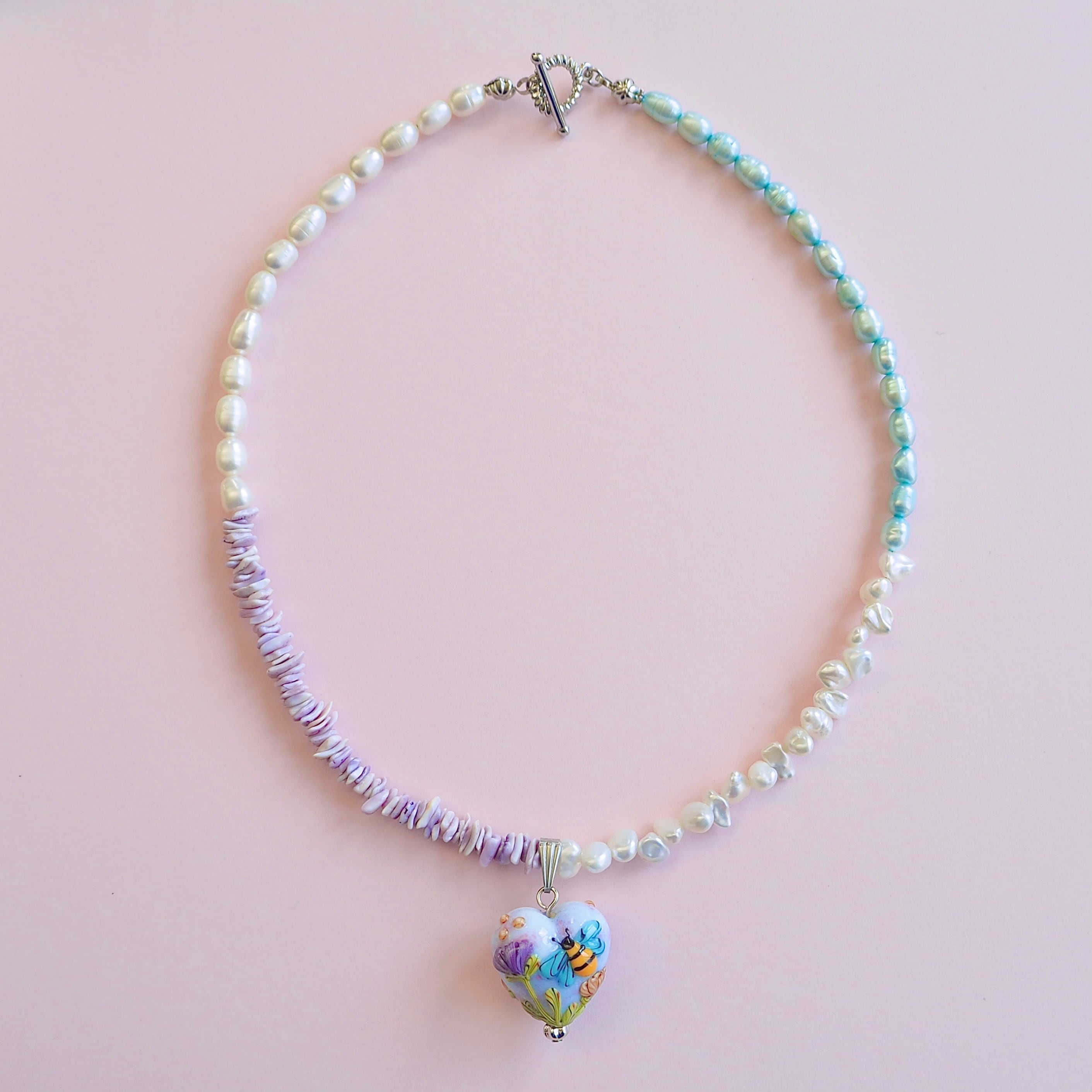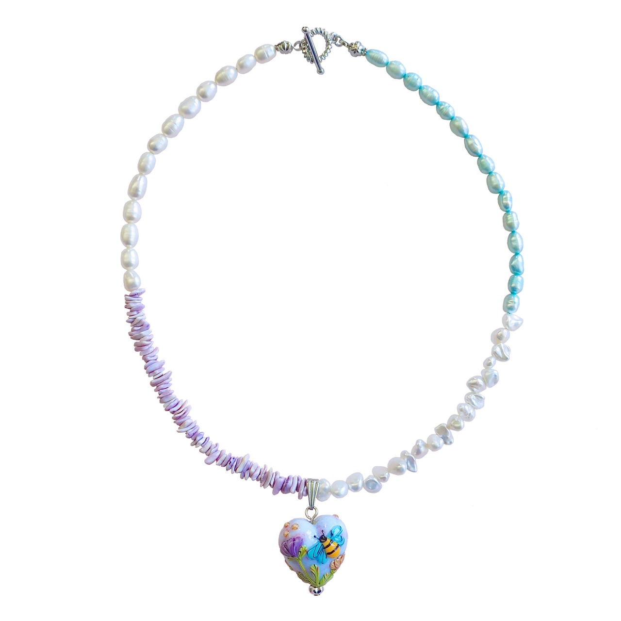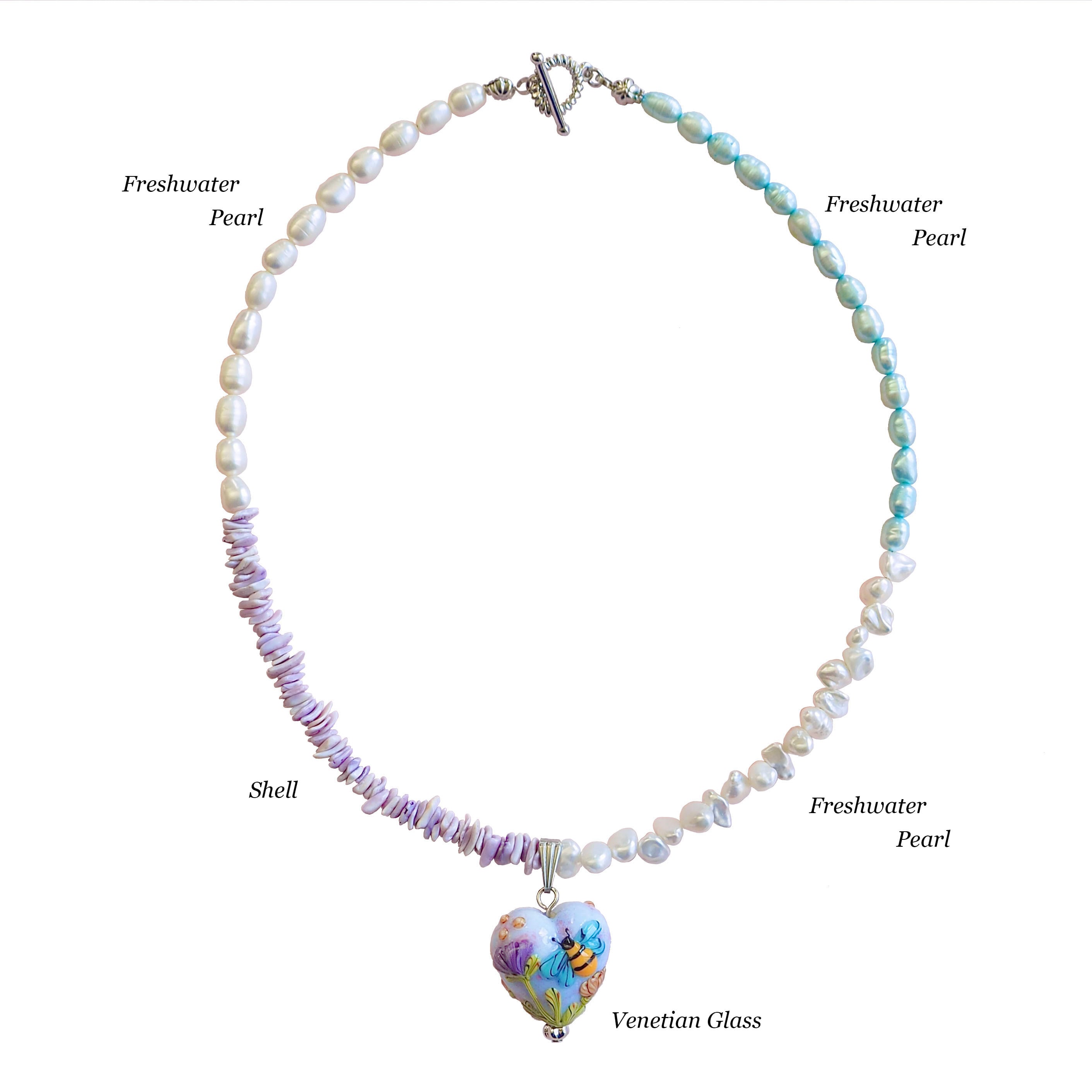 トップのハチがとてもかわいいハート型のベネチアンビーズは、モチーフの立体感や繊細さが特徴の貴重なビーズです。ビーズネックレスは3種類の淡水パールと、パープルのシェルビーズを使用。