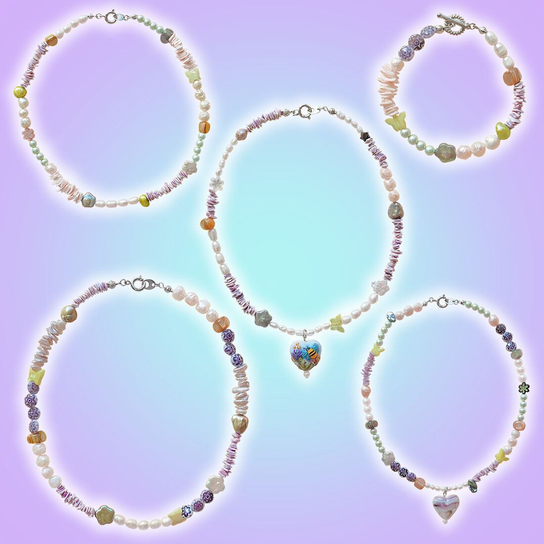カラフルで様々なモチーフの淡水パールやシェルを詰め込みました。かわいいフラワーやバタフライと輝きのある淡水パールが絶妙にマッチした、おすすめのアイテムです。